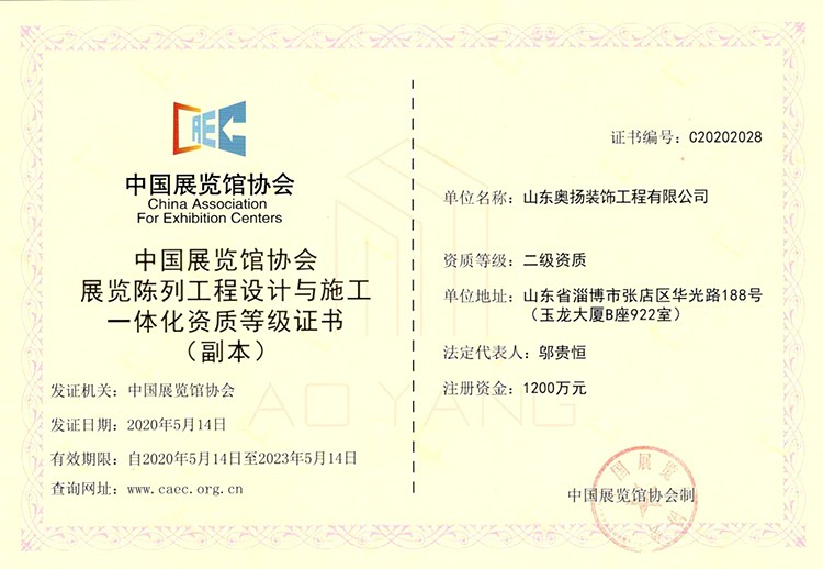 中國展覽館協(xié)會展覽陳列工程設(shè)計與施工一體化資質(zhì)等級證書